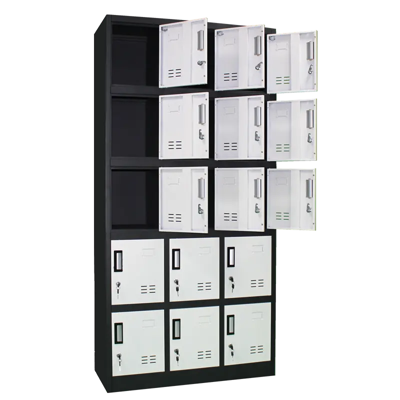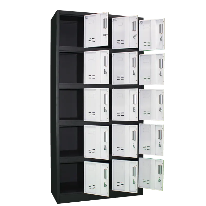 An Office Steel Cabinet with 15 Lockers is a highly functional storage solution designed for secure, organized storage in busy workplace environments such as offices, factories, schools, gyms, or hospitals. Made from high-quality cold-rolled or powder-coated steel, this cabinet is built to withstand daily use while resisting corrosion, scratches, and dents. It features 15 individual compartments, each equipped with its own lockable door—either using key locks, padlock hasps, or digital locks depending on the model—ensuring privacy and safety for personal belongings, documents, or equipment. The lockers are typically arranged in a 3-column by 5-row format, optimizing vertical and horizontal space while maintaining easy access to each unit. Each compartment offers sufficient room for items like bags, shoes, files, or electronic devices, and may include vents for airflow to prevent odors and moisture buildup. The cabinet’s clean, compact design allows it to fit seamlessly into office layouts or shared staff areas, offering a practical and secure storage option for multiple users.